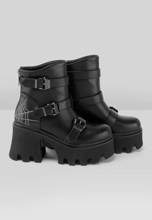 Niitit, ketjut ja pentagrammit: Killstarin kengissä on jo pimeät yksityiskohdat mukana. Olipa kyse sandaaleista tai korkokengistä, jokainen malli on suunniteltu goottiskenen tummiin tyyleihin. Yksityiskohtaiset koristeet, kuten pitsi- tai hämähäkinseittikuviot, tekevät jokaisesta kengästä ainutlaatuisen. Lisäksi kengät on valmistettu keinonahasta, mikä tekee niistä vegaanisia. Tukevat Killstar-saappaat palvelevat sinua monissa konserteissa, joten valitse suosikkiparisi jo tänään!
